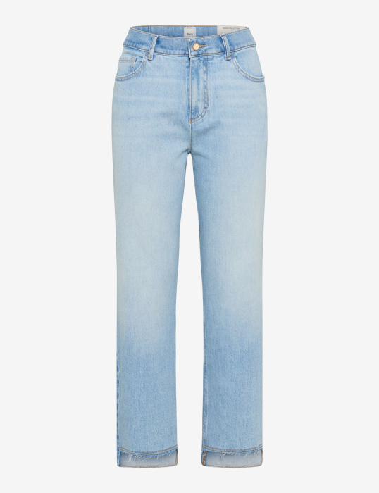 E timpul pentru o actualizare a modei. Cu blugii cu cinci buzunare STYLE MADISON S, alegi un look care este atât la modă, cât și elegant fără efort. Acești blugi impresionează prin croiala lor dreaptă, relaxată și talia regulată. Detaliile clasice, precum buzunarele laterale emblematice, buzunarul practic pentru monede și buzunarele aplicate la spate, le subliniază caracterul autentic, dar adevăratul punct culminant este deschizătura piciorului. Un tiv cool cu franjuri adaugă o notă modernă cusăturii interioare scurte, transformând acești blugi pentru femei într-o piesă vestimentară casual statement. Senzația este la fel de plăcută ca și aspectul. Confecționați dintr-un amestec de bumbac de înaltă calitate, te vei bucura de proprietățile naturale și respirabile ale bumbacului. Datorită atingerii elastanului, materialul se mișcă odată cu tine fără efort, fără a-și pierde forma. Denimul strălucește cu adevărat - este autentic, robust și durabil, exact ceea ce te-ai aștepta de la o pereche de blugi preferată de lungă durată, care adaugă caracter ținutelor relaxate.