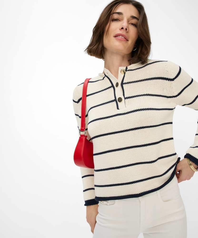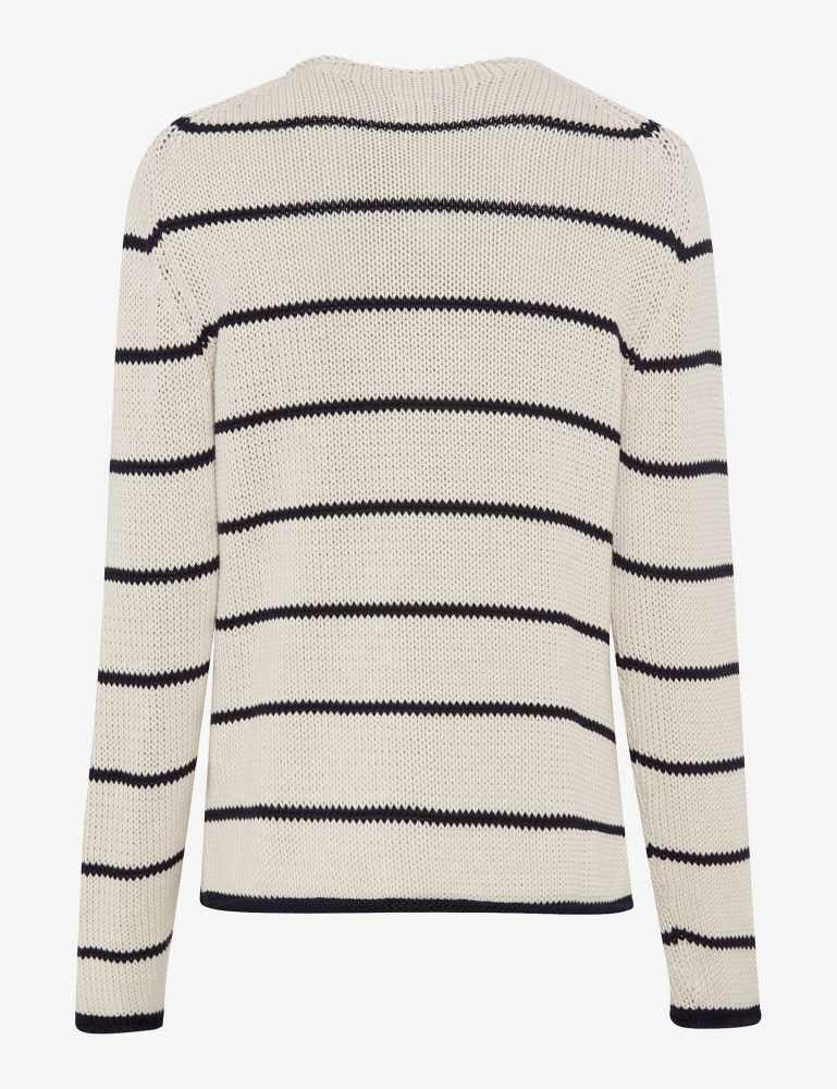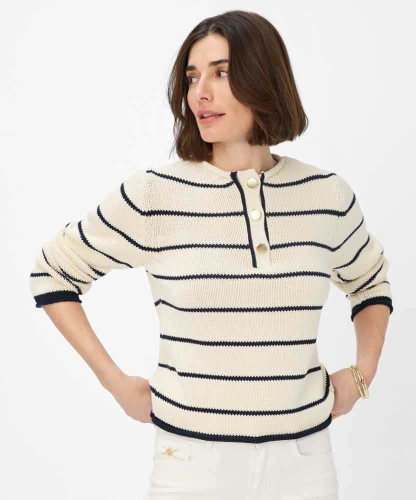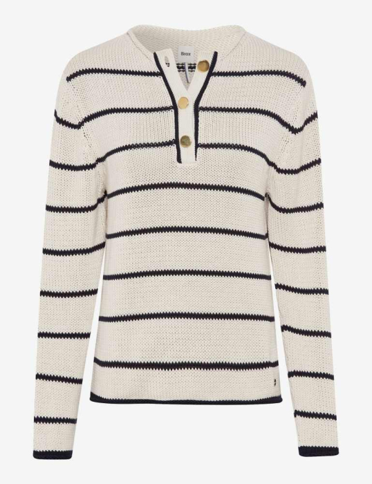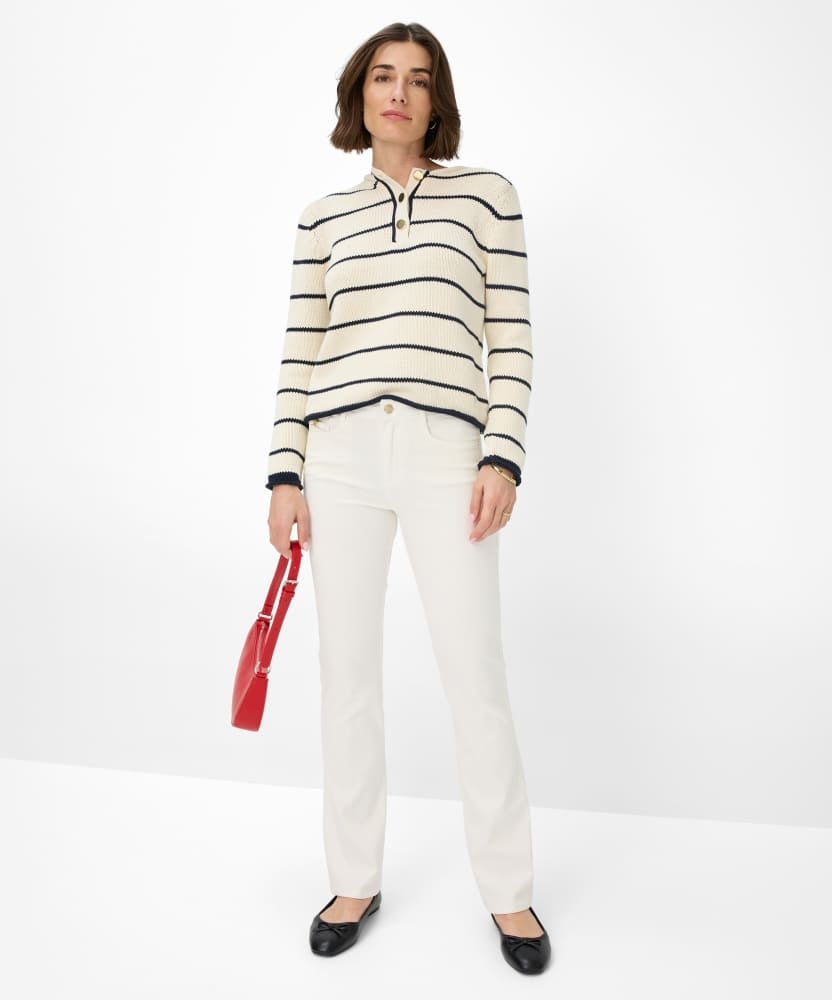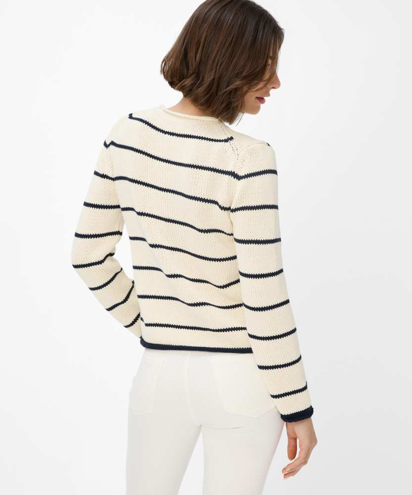 Cu liniile sale curate și designul expresiv, puloverul tricotat în stil LESLEY este o declarație de modă. Modelul cu dungi si gulerul cu nasturi conferă siluetei drepte un dinamism modern și un aspect contemporan. Bumbacul plăcut de moale mângâie ușor pielea, este respirabil și garantează confort general - ideal pentru orice sezon. Aspectul texturat conferă puloverului de damă o senzație unică, adăugând varietate și un caracter vibrant și modern.