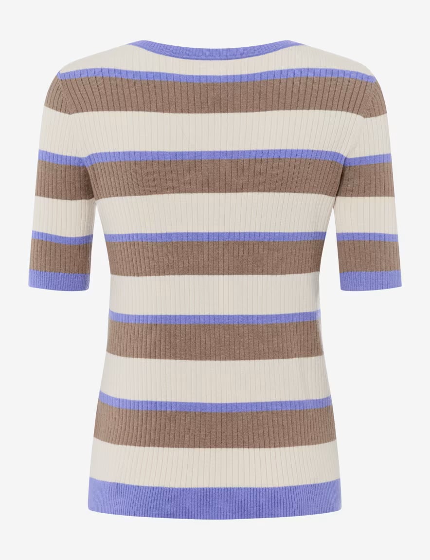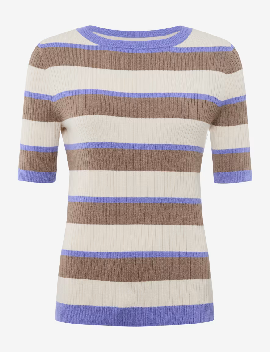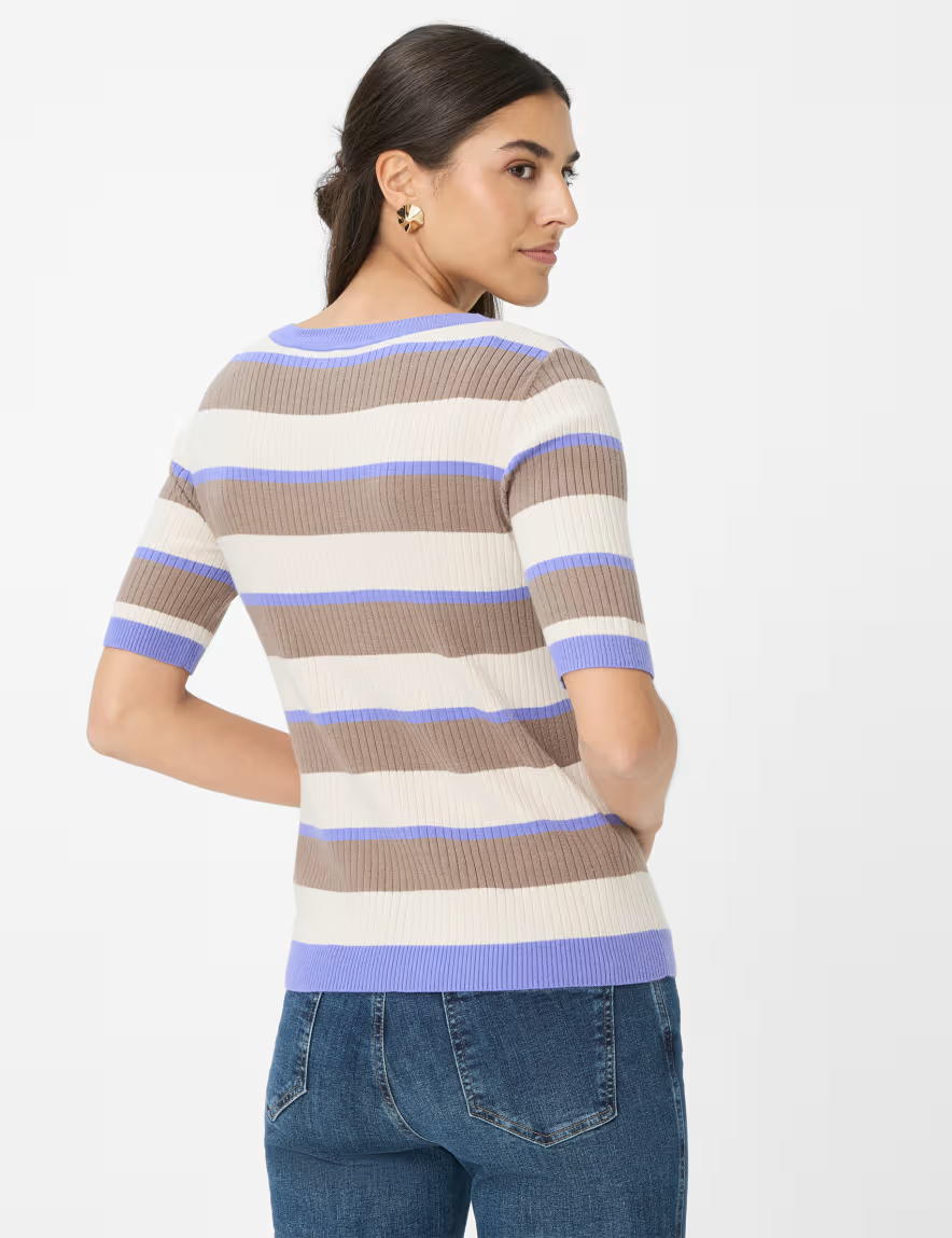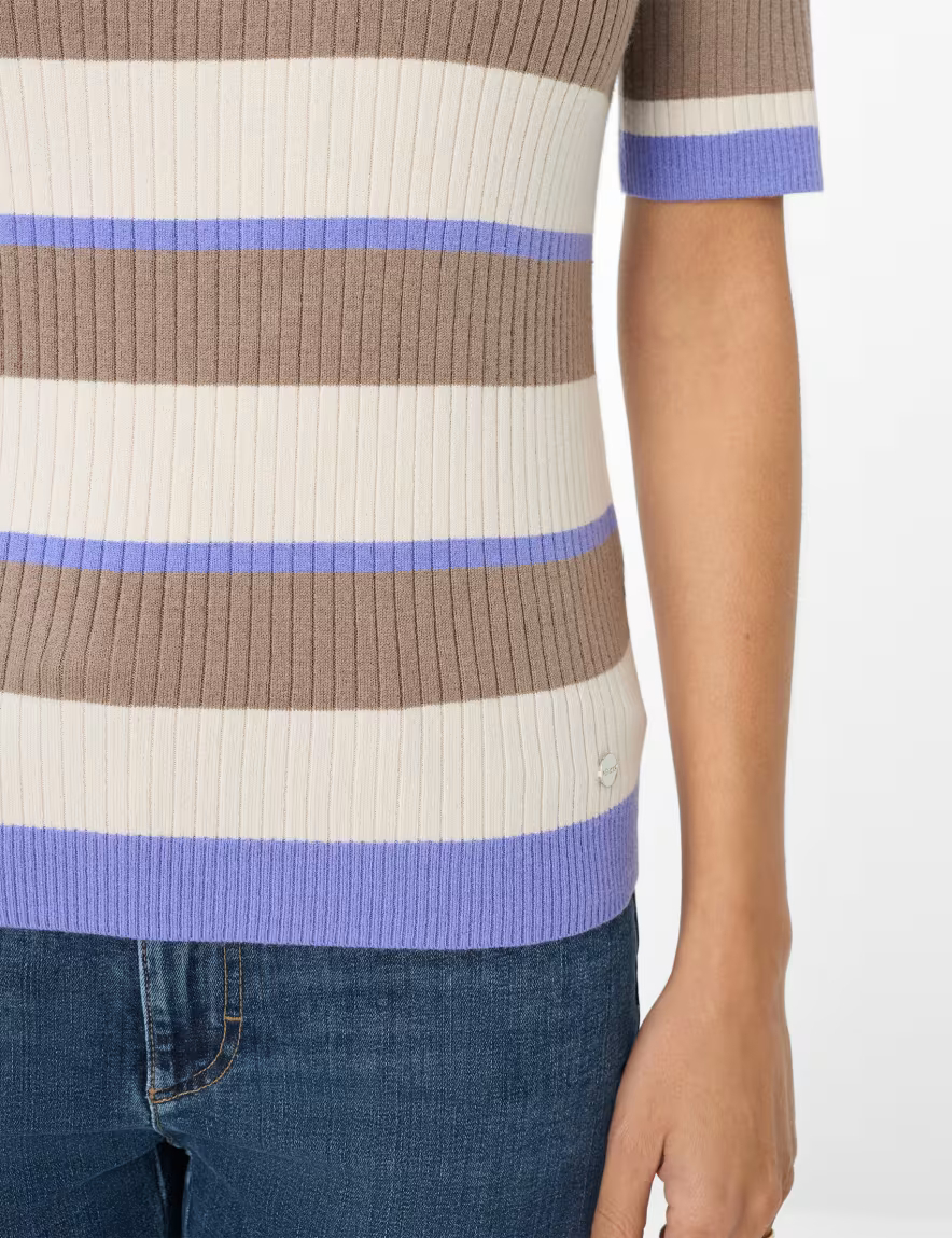 Acest pulover tricotat STYLE LYNN atrage imediat atenția cu modelul său unic cu dungi în cele mai noi culori de toamnă. Un detaliu deosebit de reușit este utilizarea violetului la modă nu doar ca dungi, ci și ca o pată de culoare la tiv. În rest, puloverul cu mânecă scurtă are un design clasic, care, datorită gulerului rotund frumos lucrat și siluetei mulate, are un aspect modern, dar feminin. Fabricat dintr-un tricot sport cu nervuri, această piesă vestimentară impresionează prin compoziția materialului de înaltă calitate. Amestecul elegant de lână și viscoză combină senzația moale și fluidă a viscozei cu ușurința călduroasă a lânii și proprietățile de menținere a formei poliamidei. Fie că sunteți la birou, fie în timpul liber, acest pulover pentru femei este o declarație clară de modă. Material: 15% lână, 50% viscoză, 35% poliamidă
