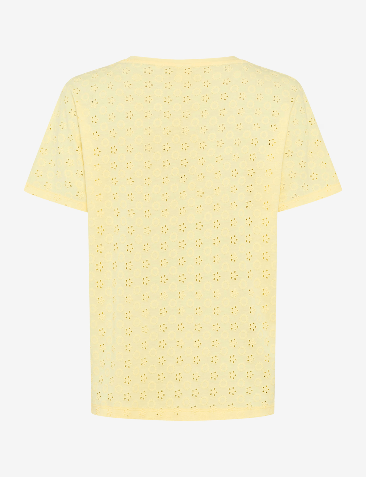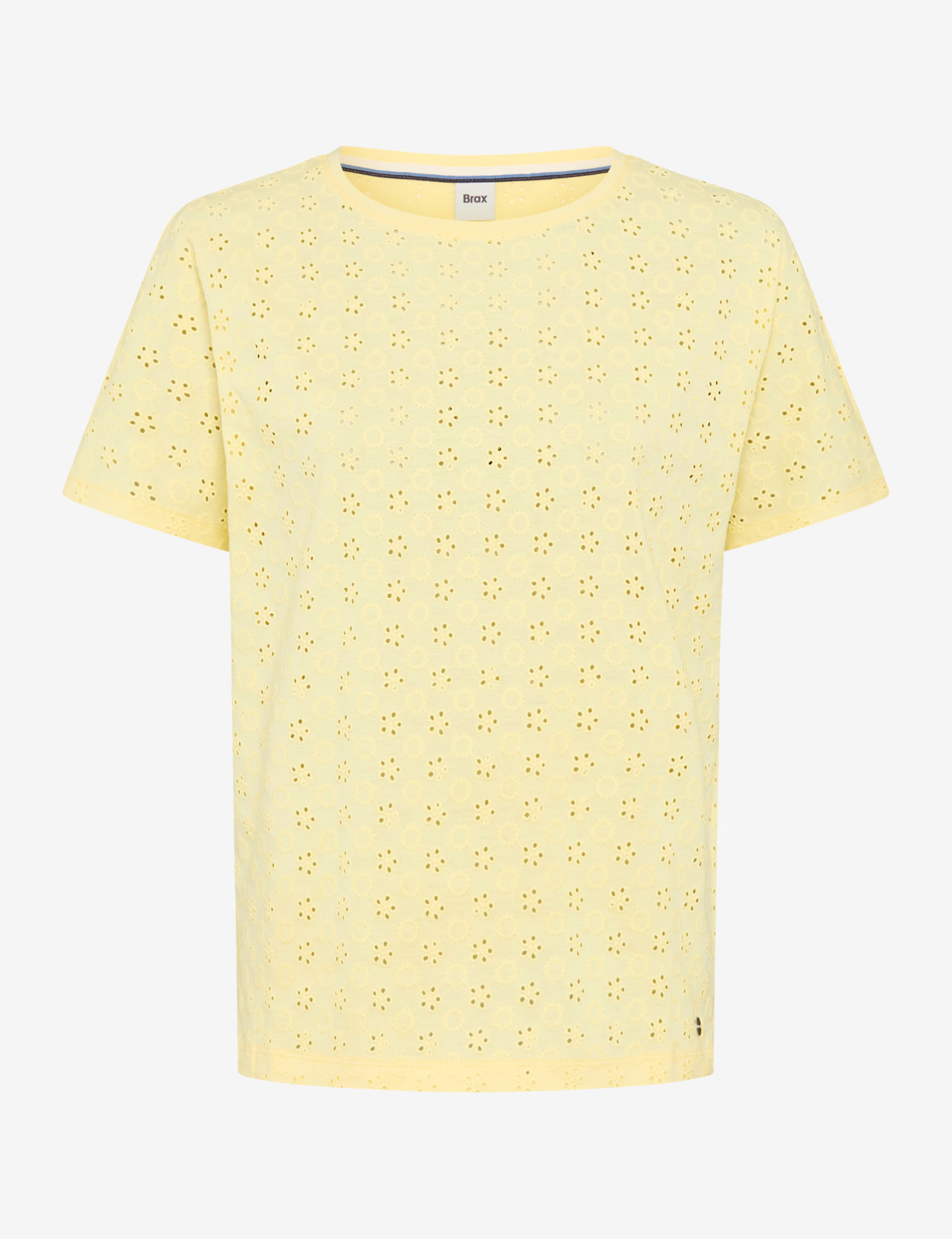 Tricoul în stil Caelen este un element de atracție estivală pentru garderoba ta. Croiala lejeră, combinată cu umerii căzuți, creează o siluetă modernă, relaxată, care surprinde perfect senzația feminină și estivală. Broderia delicată cu ochiuri de ochi servește drept element central de design, atrăgând privirea și conferind materialului un aspect texturat, de înaltă calitate, completat armonios de gulerul rotund clasic. Această senzație de confort este sporită de utilizarea bumbacului pur, o fibră naturală cunoscută pentru proprietățile sale prietenoase cu pielea și respirabile. Prelucrat ca single jersey, materialul se mândrește, de asemenea, cu o drapaj neted și suplu și o senzație moale, subliniind și mai mult confortul excepțional al acestei piese vestimentare la modă.