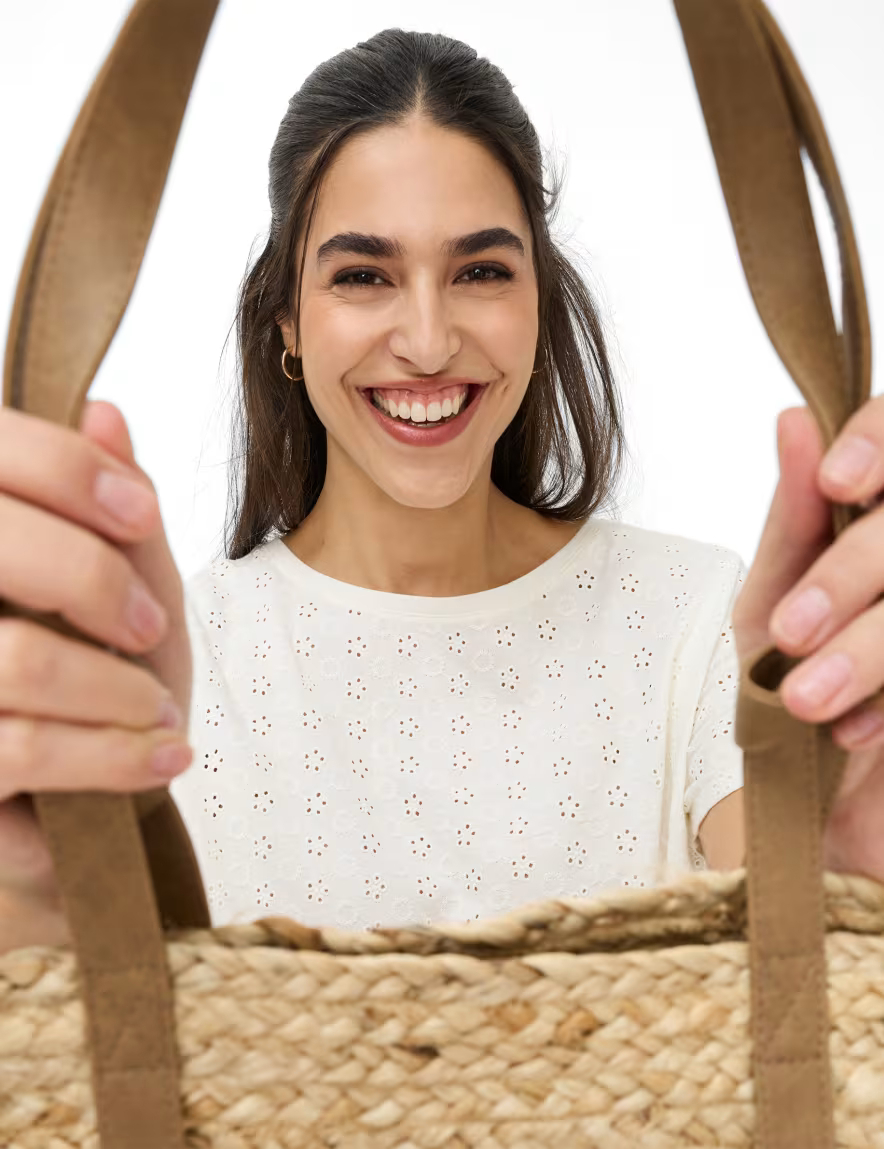Tricoul în stil Caelen este un element de atracție estivală pentru garderoba ta. Croiala lejeră, combinată cu umerii căzuți, creează o siluetă modernă, relaxată, care surprinde perfect senzația feminină și estivală. Broderia delicată cu ochiuri de ochi servește drept element central de design, atrăgând privirea și conferind materialului un aspect texturat, de înaltă calitate, completat armonios de gulerul rotund clasic. Această senzație de confort este sporită de utilizarea bumbacului pur, o fibră naturală cunoscută pentru proprietățile sale prietenoase cu pielea și respirabile. Prelucrat ca single jersey, materialul se mândrește, de asemenea, cu o drapaj neted și suplu și o senzație moale, subliniind și mai mult confortul excepțional al acestei piese vestimentare la modă.