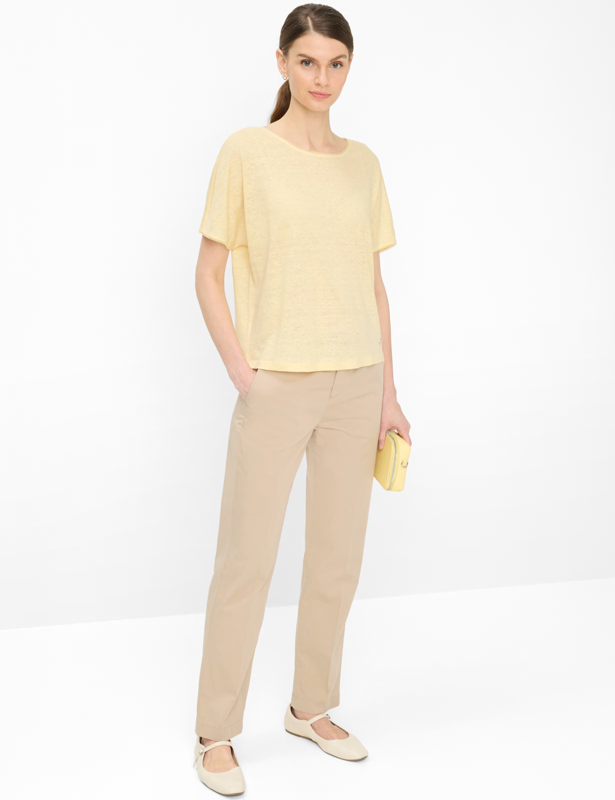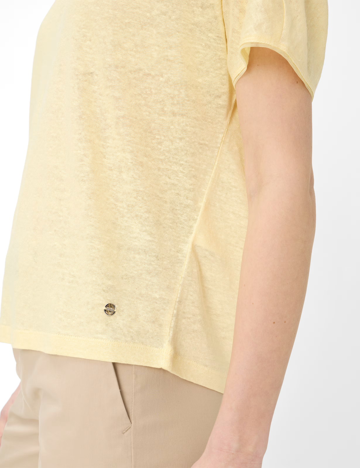 Tricoul în stil Caelen întruchipează un look casual, perfect pentru lunile mai calde. Designul este definit de o siluetă modernă, cu umeri căzuți și o croială relaxată, lejeră, la modă. Un guler rotund clasic și mâneci semilungime completează look-ul, îmbinându-se armonios în designul general. În conformitate cu această croială lejeră, cămașa pentru femei este confecționată din in pur, apreciat pentru respirabilitatea excelentă și efectul natural de răcorire asupra pielii. Această fibră naturală de înaltă calitate nu numai că asigură o senzație confortabilă, dar conferă și topului un aspect sofisticat, dar discret, datorită texturii sale caracteristice.
